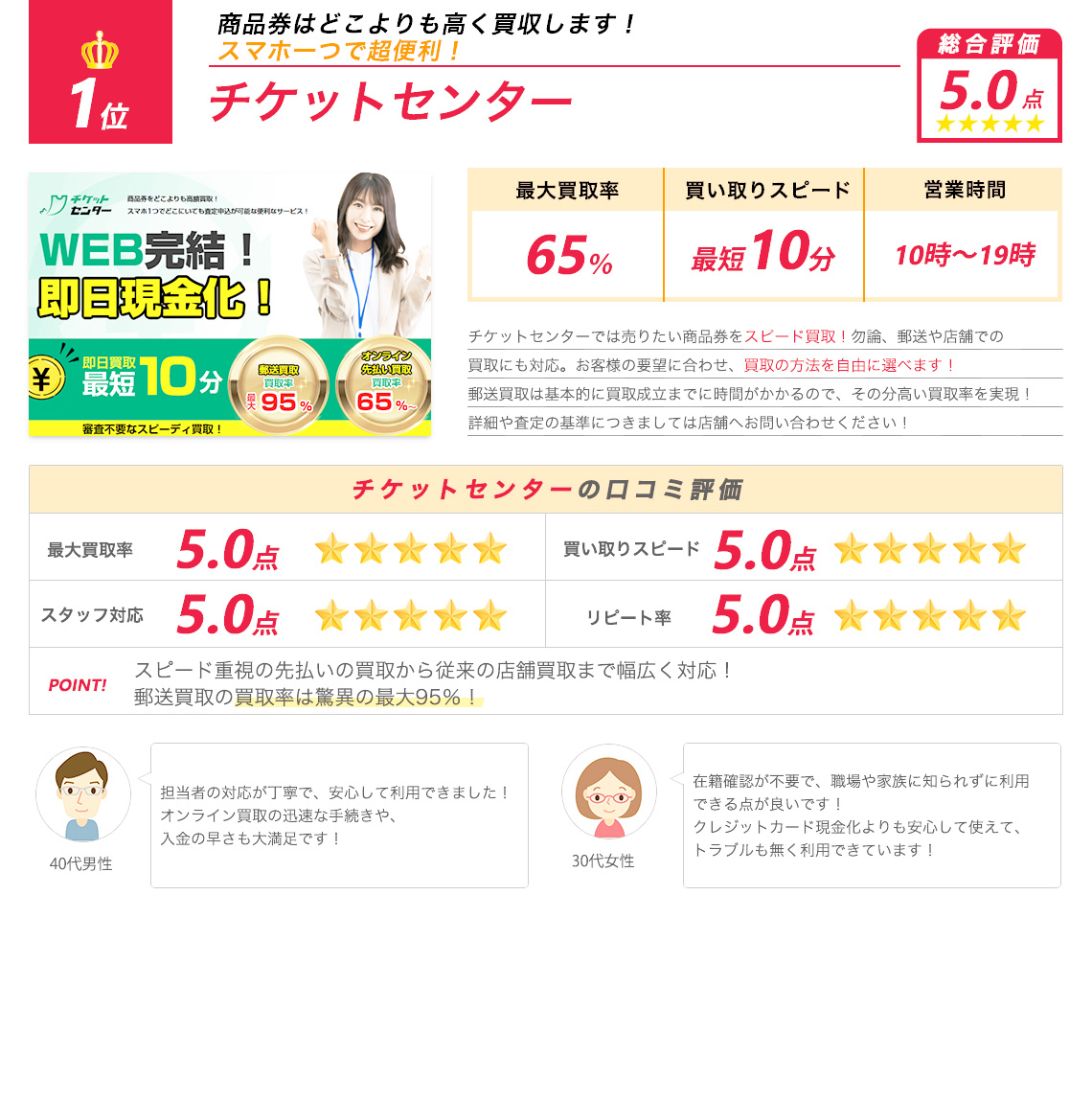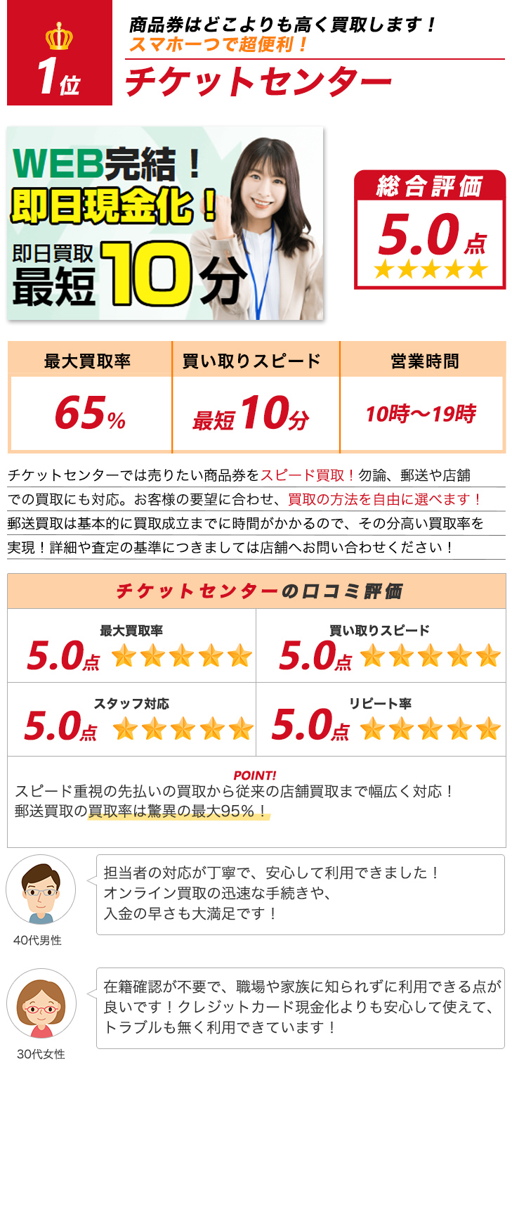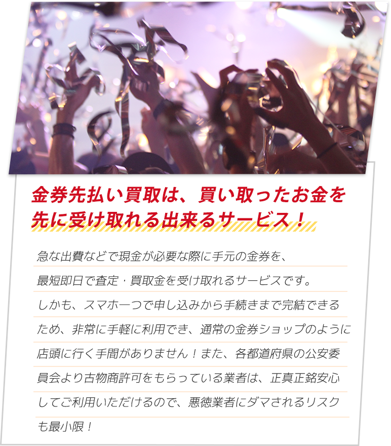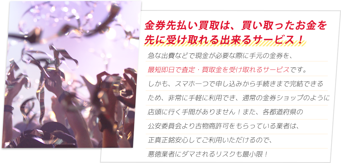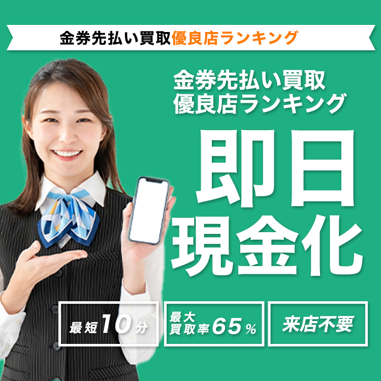 当サイトのランキングは、実際の調査結果を元に独自の基準で作成したものです。 ご紹介する内容については十分精査をしておりますが、ご利用の際にはお問い合わせなどを行いお取引内容よくご確認の上ご利用ください。 また各店舗の判断基準によってお客様のご状況によりお申込みが受けられないこともございます。 ※金券先払い買取は各機構から注意喚起されております。ご利用にあたってはご自身の判断でご注意してご利用ください。