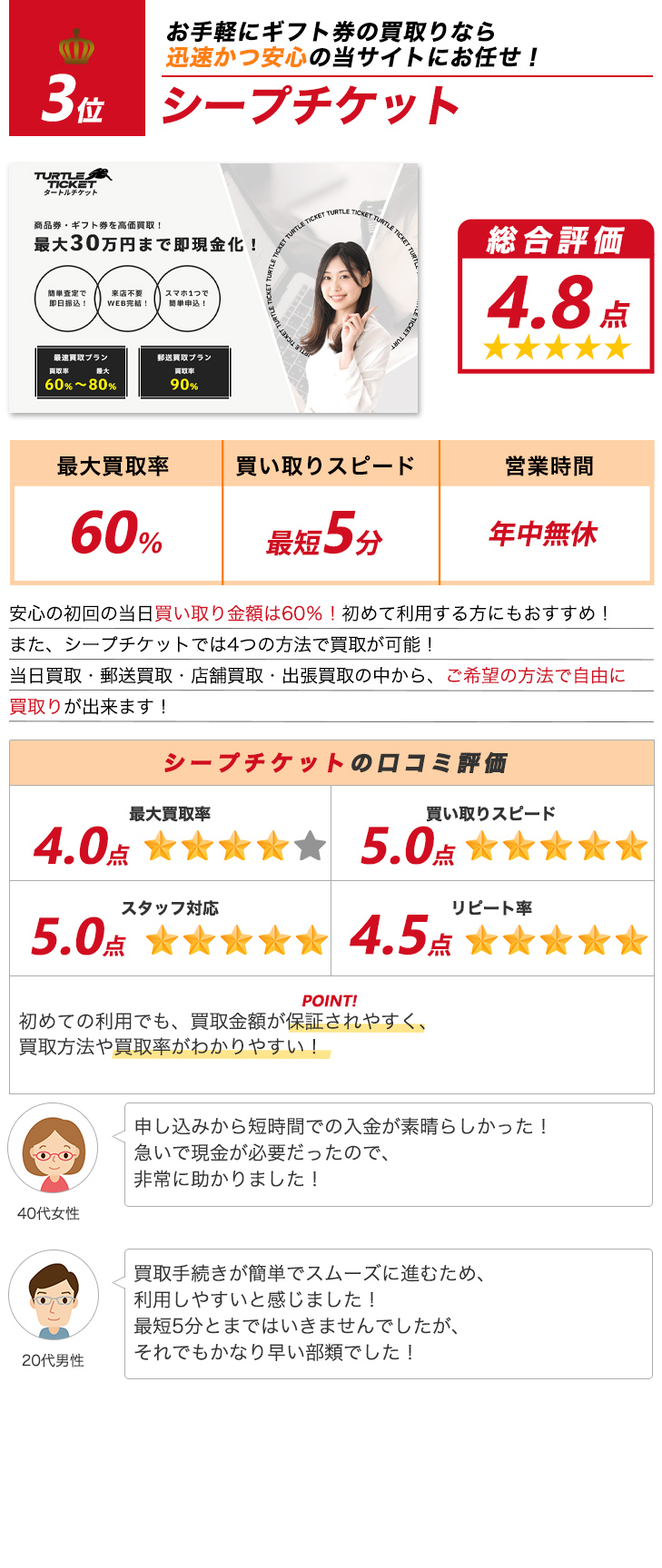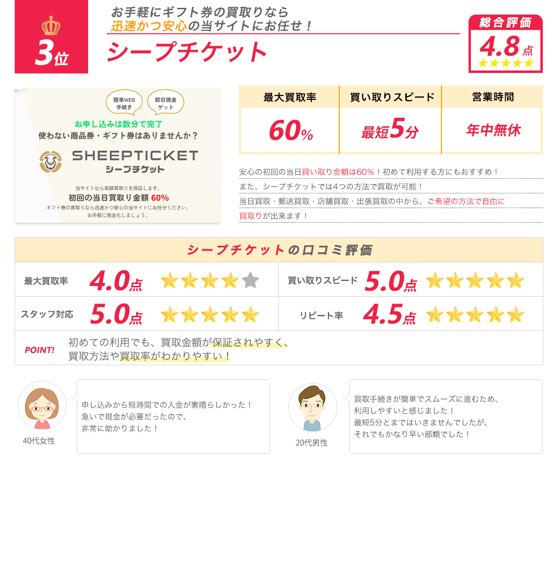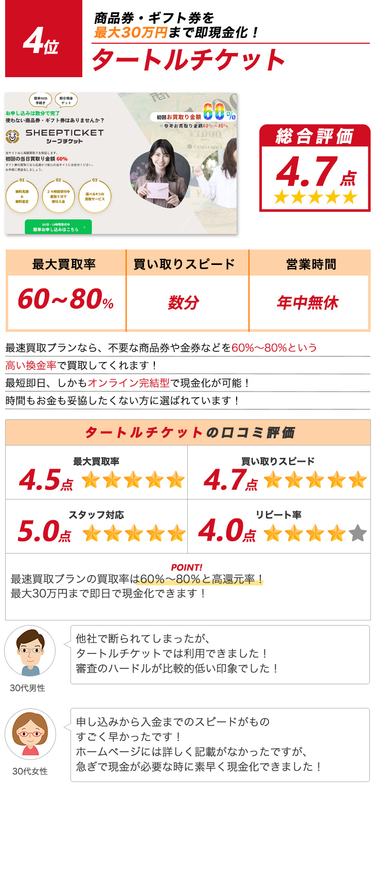当サイトのランキングは、実際の調査結果を元に独自の基準で作成したものです。 ご紹介する内容については十分精査をしておりますが、ご利用の際にはお問い合わせなどを行いお取引内容よくご確認の上ご利用ください。 また各店舗の判断基準によってお客様のご状況によりお申込みが受けられないこともございます。 ※金券先払い買取は各機構から注意喚起されております。ご利用にあたってはご自身の判断でご注意してご利用ください。